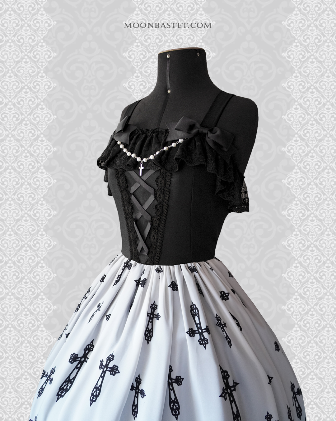 ►French chiffon fabric with inner lining, embroidered cotton lace, ribbon and metal cross and pearls.